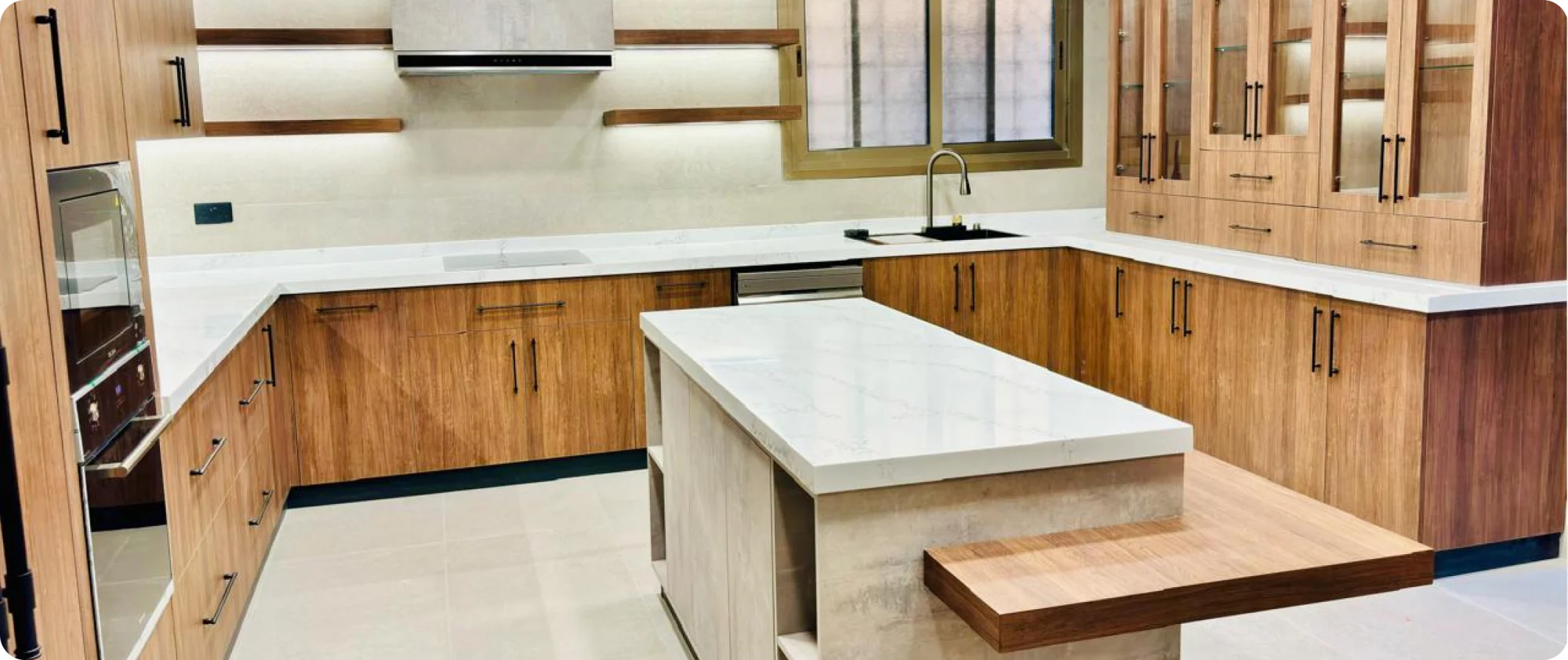مطابخ خشبية مصممة بذكاء تجمع بين الأناقة والوظيفة مع حلول تخزين ذكية. نستخدم أفضل أنواع الخشب المعالج والمقاوم للماء والحرارة.